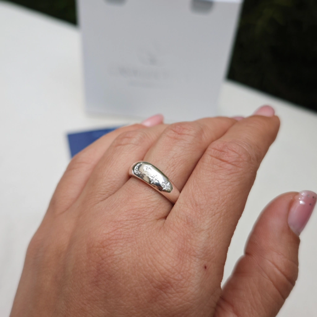 Capturá la magia del cielo nocturno en una pieza que combina simbolismo y brillo sutil. Un diseño celestial pensado para inspirar tus días y sumar un toque de luz distintivo a tu mano.